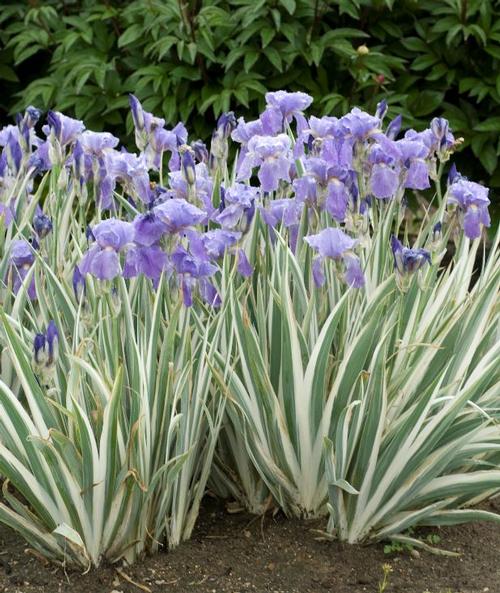 Upright foliage and early summer flowers. Flowers typically have large falls, and reduced standards, creating a flattened, round looking flower. Prefers average to marginally aquatic garden soils.